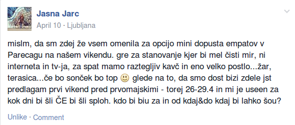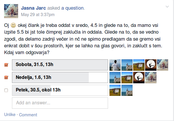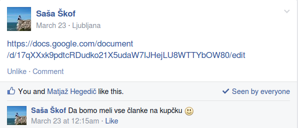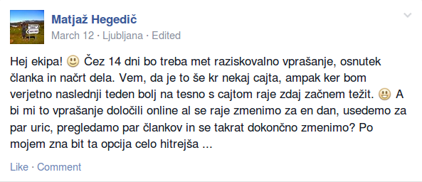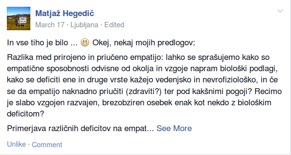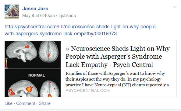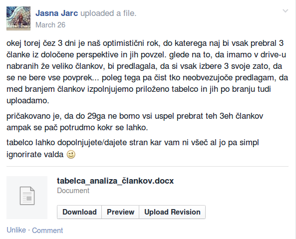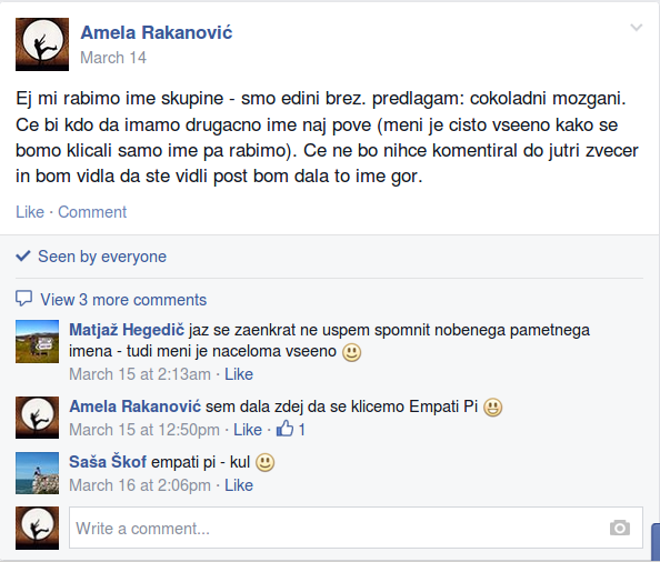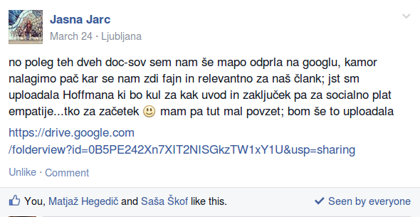 Ko si je večina sošolcev in sošolk že izbrala temo njihovega dela, nas je nekaj ostalo brez skupine, a s približno enakimi željami in interesi. Kmalu smo prišli do skupne točke in se dogovorili, da bomo pisali članek o empatiji. Skupino smo oblikovali člani Amela, Blaž, Jasna, Matjaž in Saša. Že takoj smo naleteli na problem preobsežne teme, in ko smo uspeli temo malo “skrčiti”, smo si med seboj razdelili discipline, ki so se iz različnih zornih kotov dotikale našega fenomena. Tako sta si Amela in Blaž izbrala nevrološki vidik, Saša in Matjaž razvojni in psihološki vidik, Jasna pa se je lotila fenomenologije. Naši prvi koraki so se se začeli na Facebooku, kjer smo ustvarili skupino “Naša skrivna skupina”. Tam smo se opominjali glede rokov oddaj, izpostavljali probleme, na katere smo naleteli, se dogovarjali za izlet na obalo in za naknadne sestanke. Naš največji preboj se je zgodil na obali, ko smo Jasna, Matjaž, Amela in Saša odšli na kratek “oddih”. Tri dni smo se vsako jutro zbudili, pojedli in začeli z delom. Z Blažem smo komunicirali preko telefona, Facebooka ter Google Drive-a, kjer smo imeli odprt skupen dokument, kamor smo pisali članek. Vsak dan smo se po prebranih člankih dobili za kuhinjsko mizo in se pogovorili o problemih in nasploh o tematiki, ki smo jo prebrali. Na tak način smo imeli neke vrste Journal Club-e. Pri tem smo opazili, da nam tak način dela prinaša največji napredek. Po teh treh dneh smo zaključili s prvo verzijo članka, čeprav smo se zavedali, da bo potrebno članek dodobra dopolniti, popraviti in različne discipline bolje umestiti v celoto. Po prejetih komentarjih Tomaja in sošolcev, ter po predstavitvi članka, smo se dogovorili za termin naslednjega srečanja. Tako smo se za en cel dan usedli v knjižnico, tokrat celotna skupina, in cel dan debatirali ter popravljali naše delo. Med celotnim potekom pisanja našega članka smo snemali videe, katere smo kasneje združili v predstavljeno verzijo. Supinsko pisanje članka nam je omogočilo predvsem medsebojno kritično ovrednotenje posameznih delov/poglavij članka, kar bi ob samostojnem delu verjetno izostalo. Ker je bilo napisano v vsakem trenutku dostopno vsem članom skupine, smo na hiter in učinkovit način izrazili naše pomisleke, konstruktivne predloge in izboljšave. Z dobronamernimi kritikami smo tako uspeli vsebinsko precej izboljšati vsebino članka. Kljub temu je ostalo kar nekaj odprtih vprašanj, ki smo jih poizkušali razrešiti na naših srečanjih. Delo je potekalo tekoče, v skupini smo se zelo dobro razumeli, vloge pri delu smo si izmenjevali in skupen cilj je bil dosežen po naših najboljših močeh. Kljub veliki časovni stiski in širokemu raziskovalnemu področju, ki smo si ga izbrali, smo z našim delom zadovoljni.